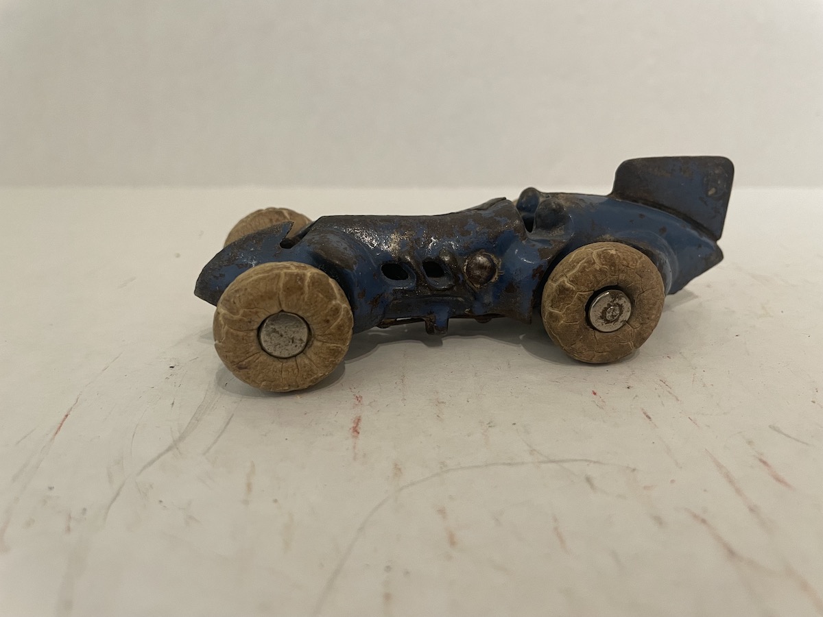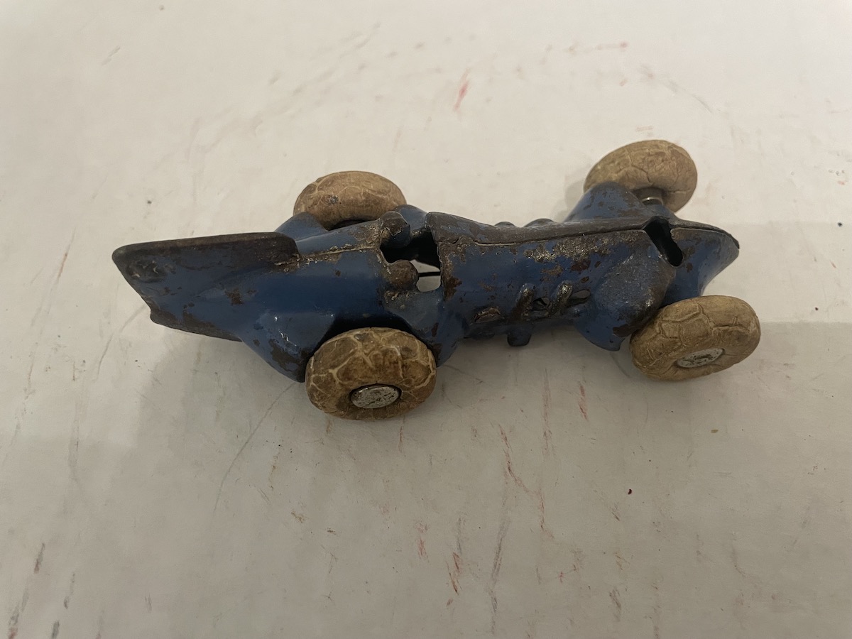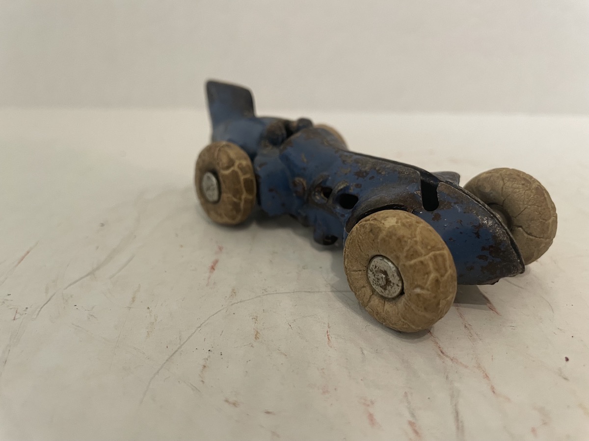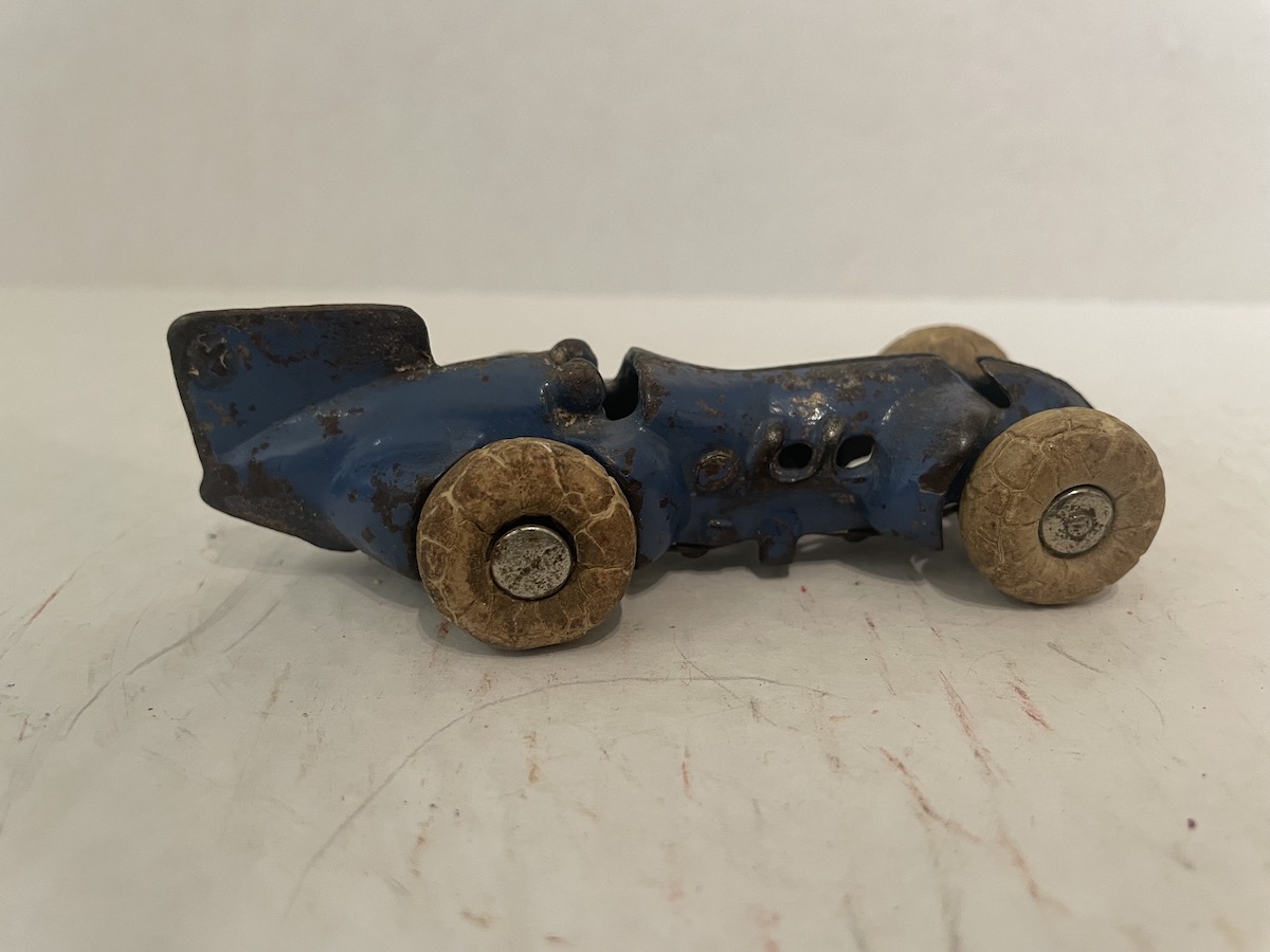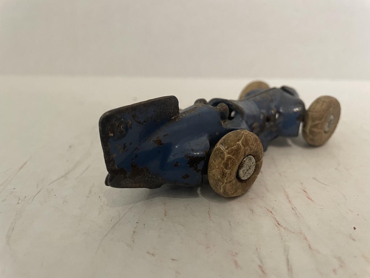 Kilgore made this futuristic looking cast iron race car in the 1930’s. The racer is 4 1/4″ long and has an excellent casting with no cracks or repairs. The blue paint is original as are the white rubber tires son metal hubs.