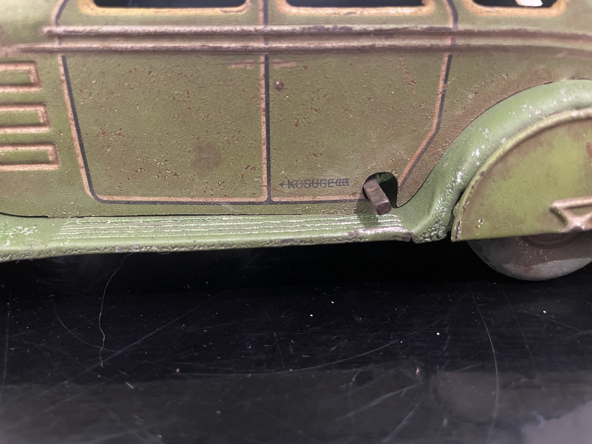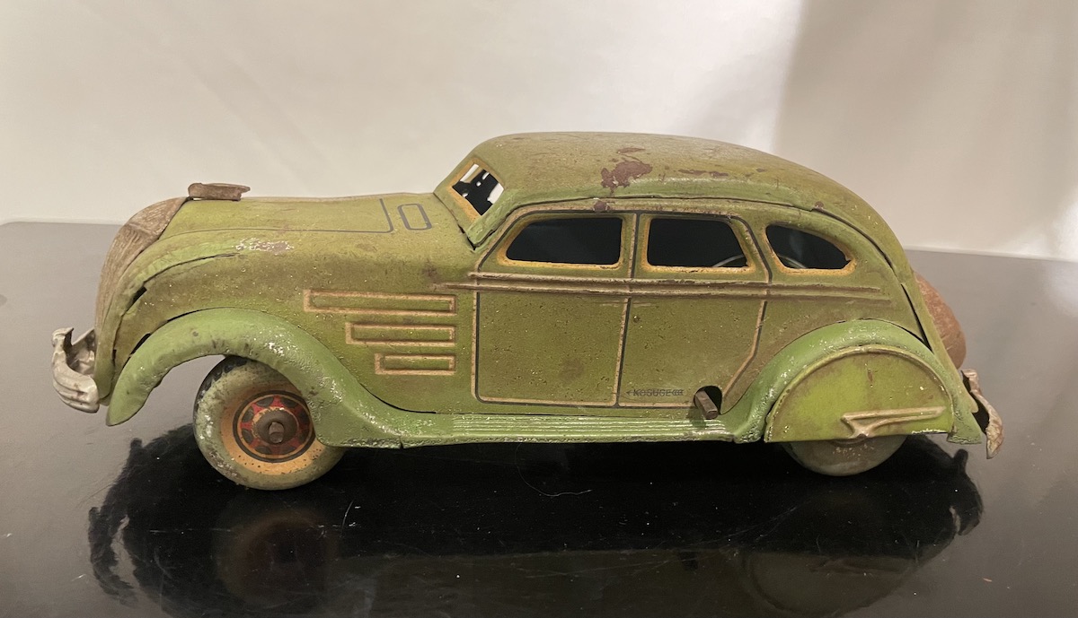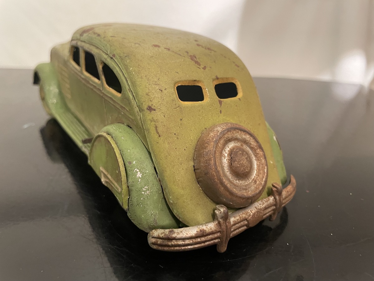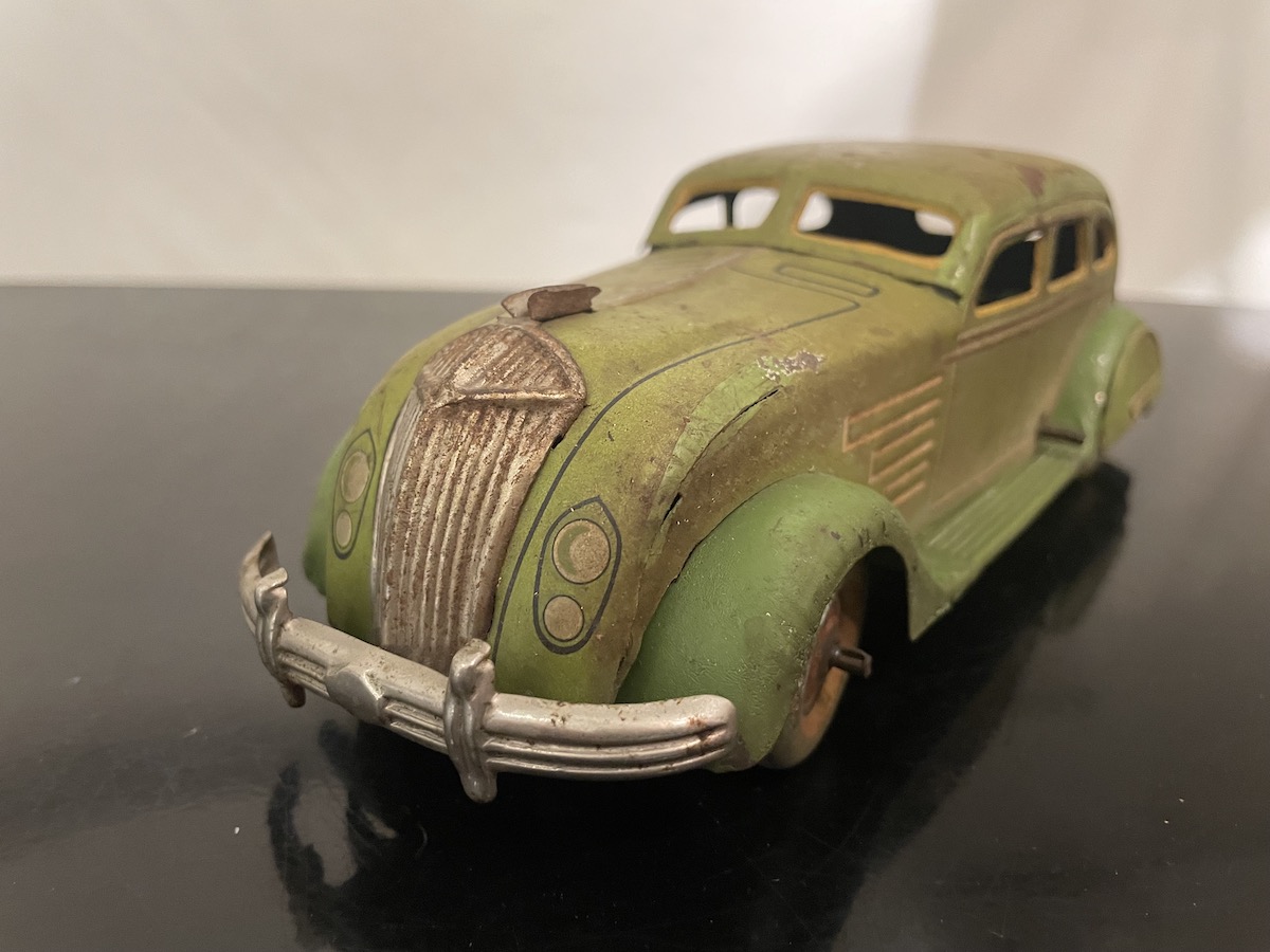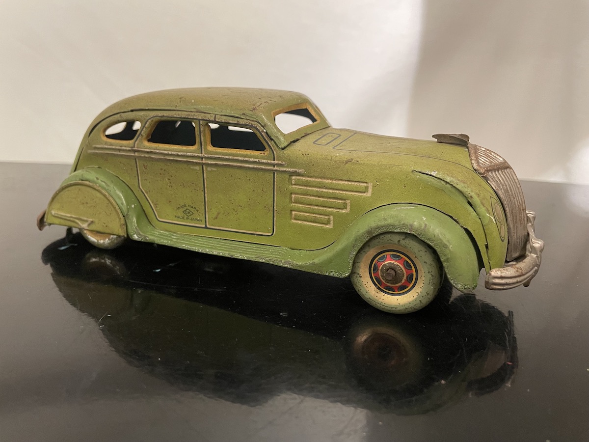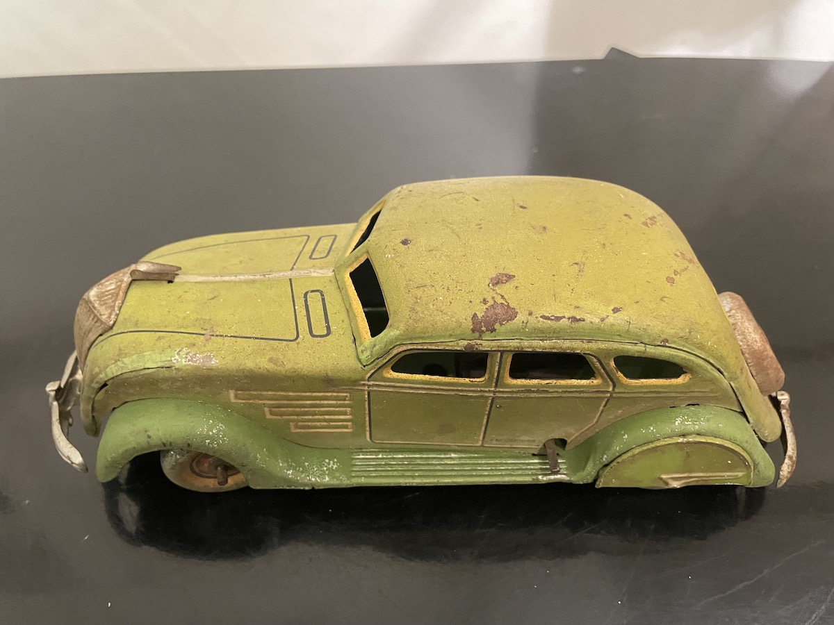 This very cool 8″ long clockwork Chrysler Airflow was made in Japan in the 1930’s. The toy is complete and original with wear to the litho as seen in the photos. The clockwork motor works as it should, and will only run when the toy is placed on a hard surface. There is tarnish to the chrome plating and wear and color loss to the finish. Not a perfect example, but it is a very cool looking vintage toy car with great patina.